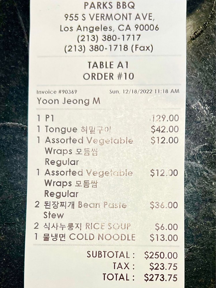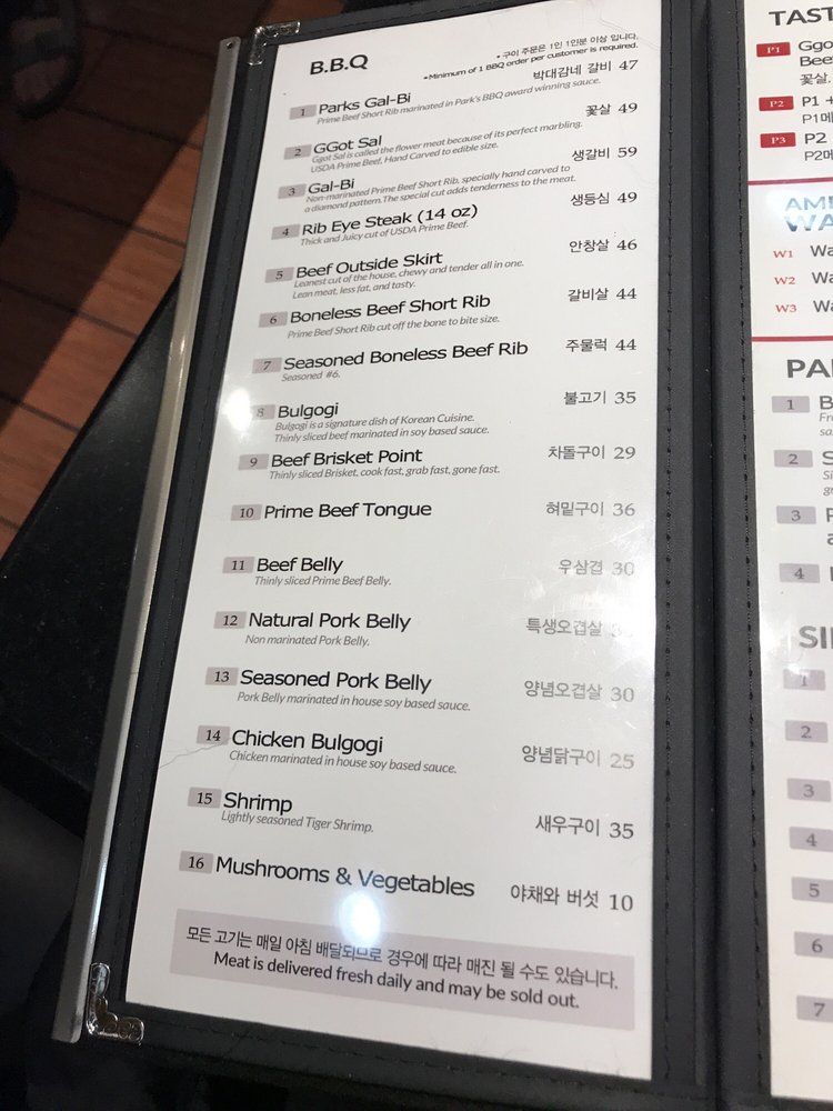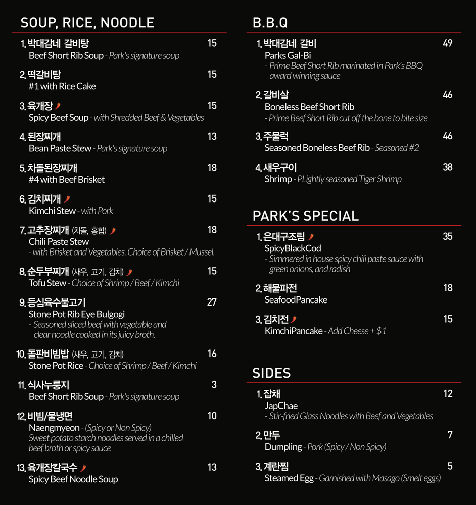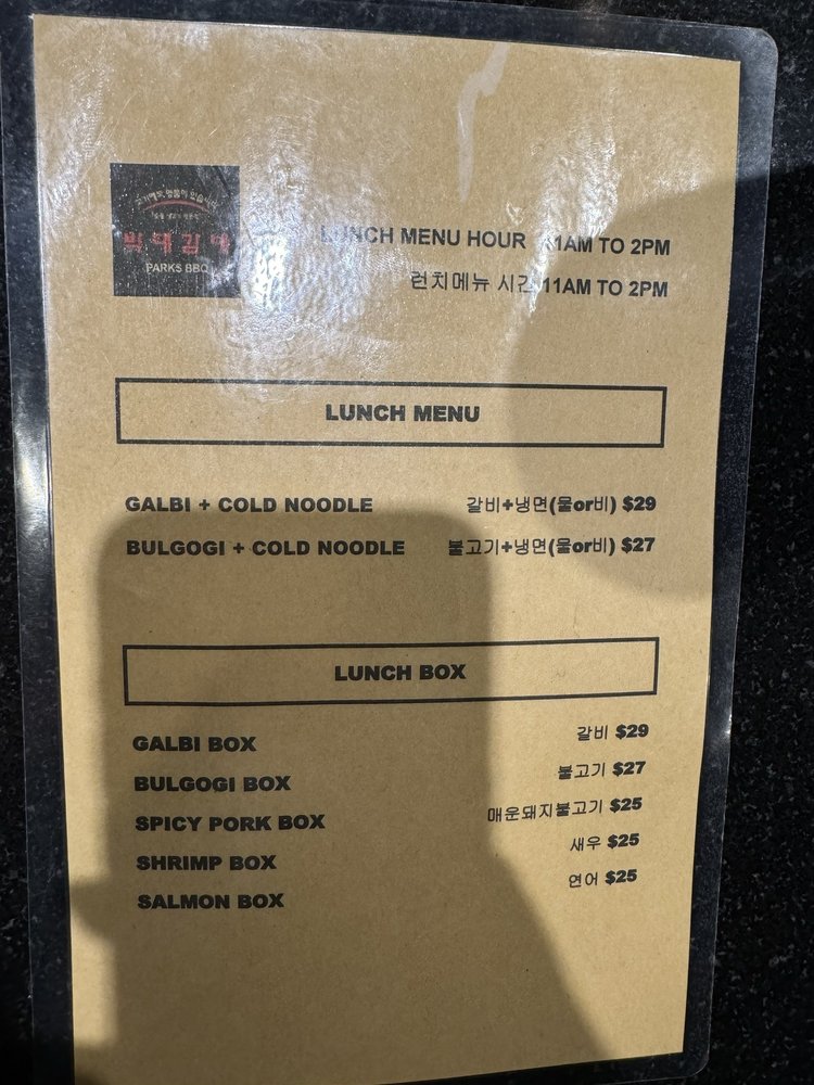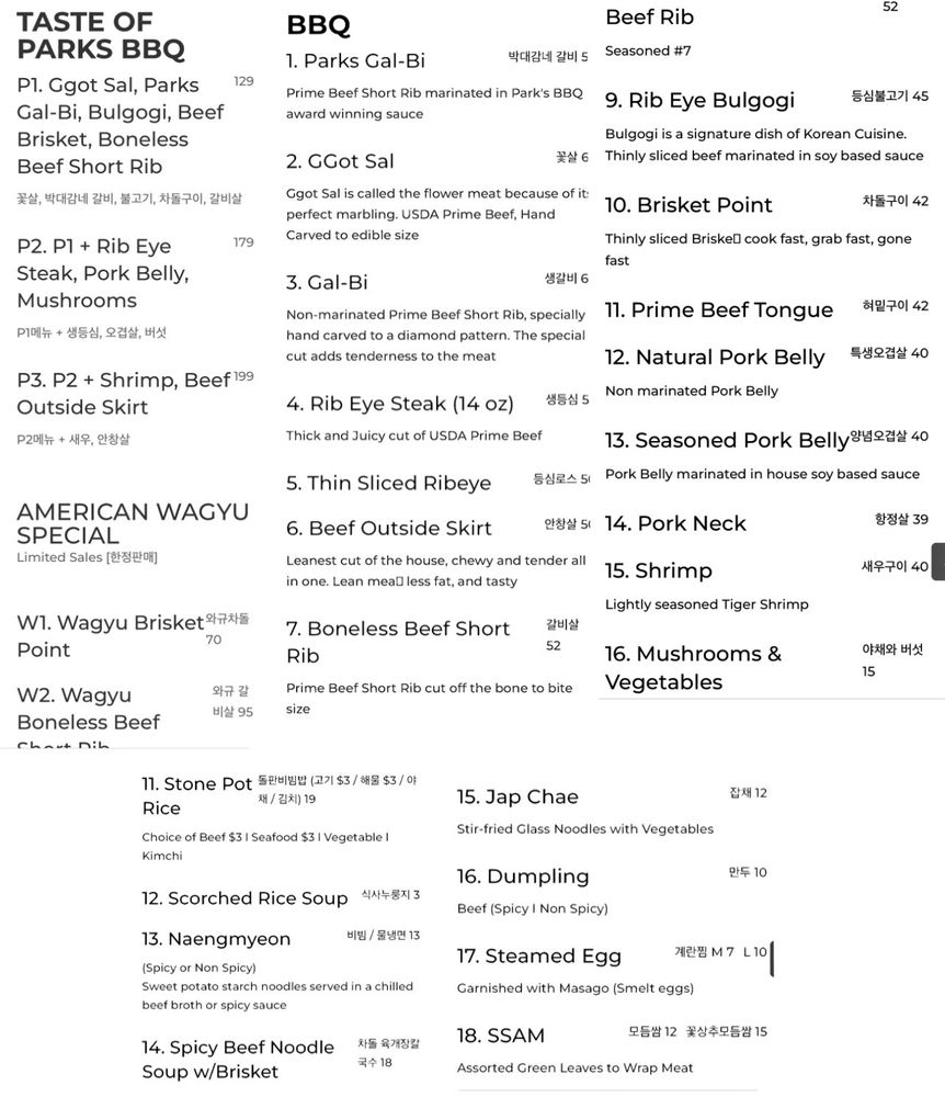 Park’s BBQ, located in Los Angeles, offers a variety of BBQ dishes in a casual setting. Known for their flavorful GalBi, boneless beef short rib, and grilled tiger shrimp, Park’s BBQ caters to meat lovers and seafood enthusiasts alike. Their signature beef short rib soup with rice cake and spicy beef soup are also highlights on the menu. Customers commend the quality of the food and attentive service, making it a popular spot for Korean BBQ. Despite being on the pricier side, the consistency in food quality and diverse menu options make Park’s BBQ worth a visit. The restaurant also offers outdoor seating, catering services, and a full bar for a complete dining experience. Whether you're a fan of traditional Korean dishes or looking for a unique dining experience, Park’s BBQ has something for everyone.